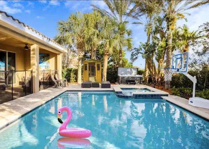 Situada en el distrito Celebration, Amazing 8Br Villa W Private Pool Spa Hot Tub Sauna Firepit And Movie Theater 10Min From Disney Orlando Fl, recibe a sus huéspedes con una piscina, un baño de vapor turco, una piscina de inmersión y una sauna.